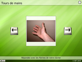 Dans cet exercice, il s'agit de décider si la main qui apparaît à l'écran est une main gauche ou une main droite. Elle peut être présentée de façons différentes : seule, en action ou vue dans un miroir.